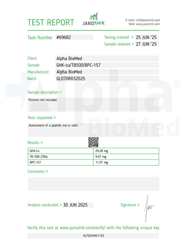 Each lot is sourced through our verified global supply chain with emphasis on traceability and quality control. We work diligently to obtain and maintain third-party analytical reports (HPLC/LC-MS) and Certificates of Analysis for each batch, as part of our ongoing quality process. These documents are reviewed internally and displayed as they become available. Independent third-party testing is also performed on select lots to confirm identity, purity, and alignment with our internal specifications.